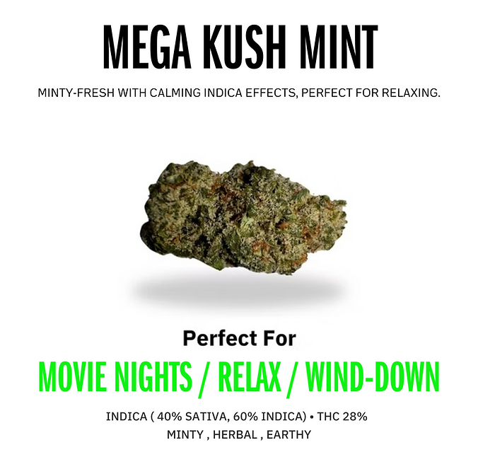 Mega Kush Mint combines minty freshness with calming Indica effects, ideal for winding down after a long day and easing physical tension.