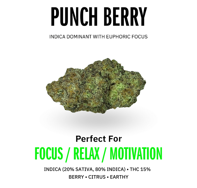Punch Berry is a strong indica-dominant strain that delivers a euphoric high while keeping the mind focused and body relaxed. With 15% THC, it provides a balanced experience ideal for users looking to unwind without losing mental clarity. The sweet berry aroma enhances the enjoyable and calming effects.